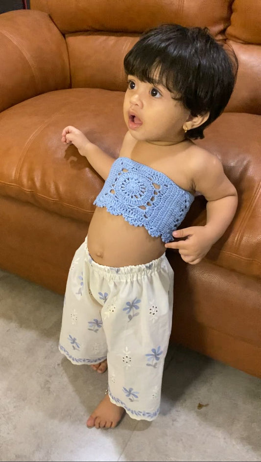 Chic sky blue crochet top with white floral embroidered pants
