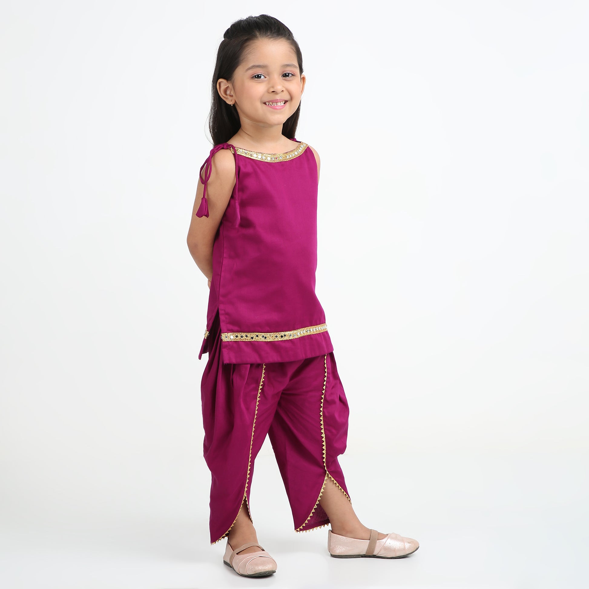 Dress your little one in timeless elegance with the Kids Magenta Solid Satin A-Line Kurta with Dhoti Pant. Crafted in a luxurious satin finish, the vibrant magenta color adds a royal charm that instantly elevates festive dressing. The solid design keeps the look classy and sophisticated, making it a perfect choice for traditional celebrations and special family moments.